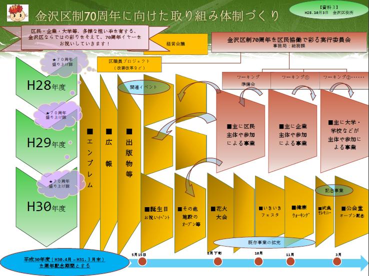 - 第2条 委員会は、金沢区が区制70周年を迎える記念の年にふさわしい各種事業を、区民、事業者、大学・学校等の、多様な担い手による彩りをそえて、実施していくことを目的とする。