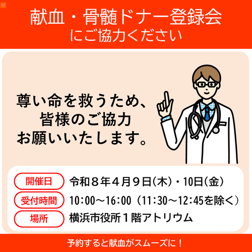 神奈川県赤十字血液センター、神奈川県骨髄移植を考える会、特定非営利活動法人グリーンリボン推進協会とともに横浜市庁舎において献血・骨髄ドナー登録会を開催します。