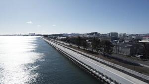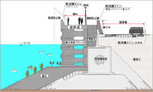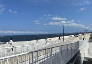 これまでのように、多くの市民の皆様が海の景色を眺めながら散策や釣りができるように、消波機能を備えたブロックで整備した護岸の上部に延長約1キロ、幅員約5メートルの遊歩道を整備しました。
