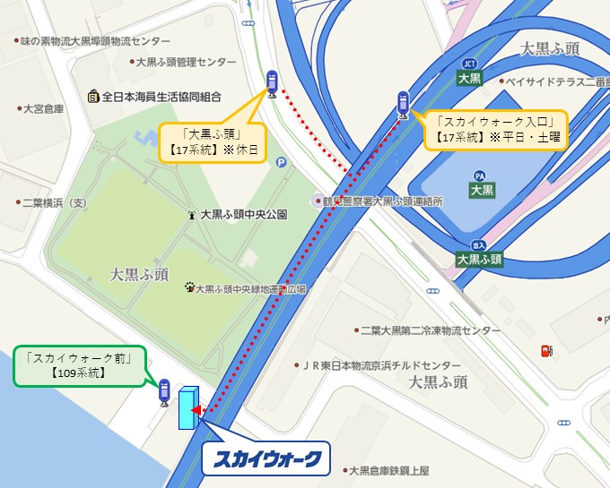 ★及び♦の時間は「大黒ふ頭」で下車、それ以外の時間は「スカイウォーク入口」で下車してください。