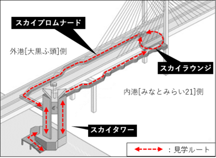 横浜ベイブリッジ併設のスカイウォークからは、普段見ることのできない港湾物流の様子がご覧いただけます。また、現在整備中の新本牧ふ頭や、客船の寄港時には迫力のあるクルーズ船を間近にご覧いただけます。さらに、展望施設「スカイラウンジ」では、新本牧ふ頭の役割や海洋工事の建設技術、環境への取り組みなどの映像上映や模型展示などを行い、市民をはじめとする来館者の皆様の横浜港への理解を促進します。