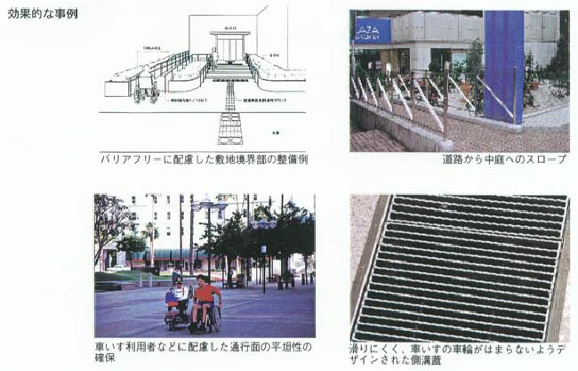 障害者・高齢者等を含め、あらゆる人々が安全・快適に移動できるよう、建物内外における通行面の平坦性の確保、滑りにくい舗装材の採用、公共空間との連続性を持たせた誘導ブロックの設置、スロープの設置等に配慮しましょう。また、機能的な性能に加え、景観との調和に配慮したデザインを工夫しましょう。