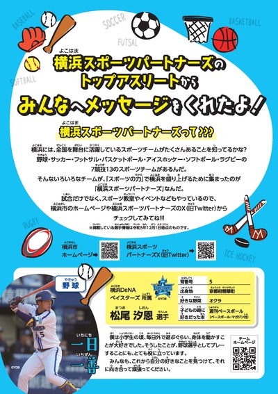 横浜スポーツパートナーズ13チームにご協力いただき、令和6年度の小学校1年生、3年生、5年生向けに発行した小学校体育副読本「たいいく」に、子どもたちへのメッセージを掲載しています。