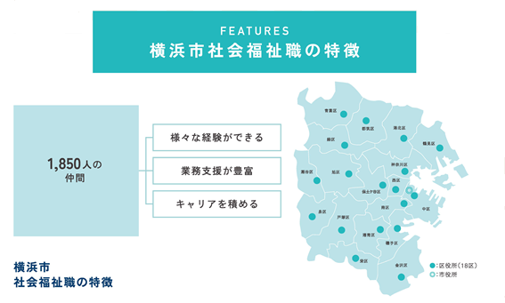 横浜市の社会福祉職は、昭和42年度から全国に先駆けて採用を開始し、複雑化・多様化する福祉課題に最前線で向き合い、市民の皆様への支援を行ってきました。特に、生活保護には至らない困窮されている方への就労支援の取組が、国の「生活困窮者自立支援制度」の創設に繋がるなど、多くの実績を残してきました。令和元年度からは心理職の採用も開始し、こどもや障害児・者の方々などの、心の声に耳を傾け、福祉や教育の分野で活躍しています。