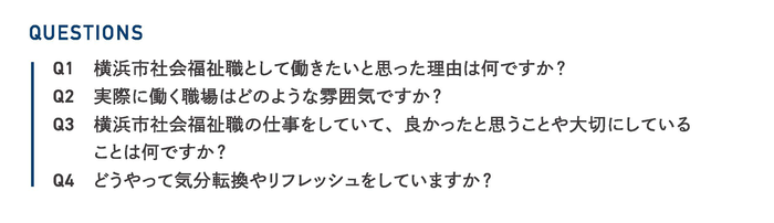 Q1 社会福祉職として、働ける分野の選択肢が広いことから、様々な業務に携わることができると思ったからです。自分と同じ専門職が多くいることから、対応や考え方について理解しやすく、他の職員と相談しやすいのではと思ったことも理由です。