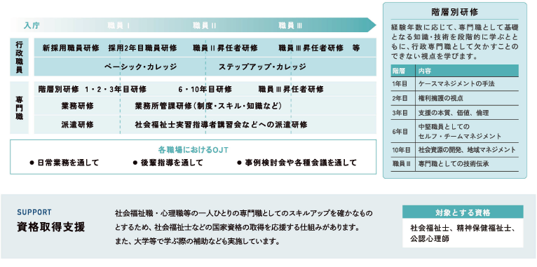 横浜市では、公務員としての自覚を持ち、行政職員としての能力を身に付けるための研修と、社会福祉職としての専門能力を身に付けるための、経験年数に応じた階層別研修を行っています。研修での学びを、職場でのOJT(On the Job Training)の中で上司や同僚と共有しながら、日々の業務で実践するという積み重ねを通して、専門職としての知識や技術、能力を磨いていきます。