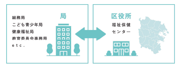 横浜市には市全体の施策展開を行う「局」と、地域の特性を活かした取組を行う「区役所」の両方に社会福祉職の配属先があり、相互作用によって市民の福祉の向上に取り組んでいます。