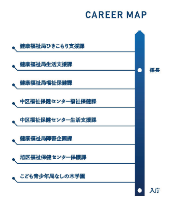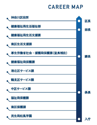 道は、大勢の人が歩くので道になります。横浜市の社会福祉職は、多くの道を作ってきました。今、区長として働いていますが、これも先輩達が作ってくれた道を歩いた結果だと思います。横浜市で、自分の成長を実感してみてください。