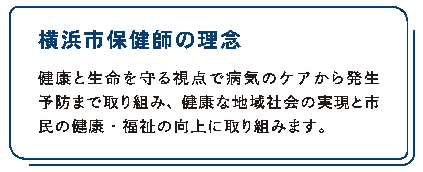 誰もが安心して自分らしく健やかに暮らせる地域社会を実現していく横浜市の保健師としての仕事は、やりがいにあふれています。公衆衛生看護の中で横浜市の保健師は、災害や感染症等の様々な健康危機の発生に備えていき、「すべての人々のくらしと地域社会の健康、生命をまもる使命と倫理」の基本姿勢をもって取り組んでいます。