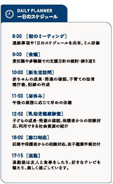 子どもの成長・発達に関する個別支援や乳幼児健診や健康教育等の集団支援を行っています。また、地域の方々と一緒に、子育てに優しいまちづくりにも取り組んでいます。月に一度の集団支援の地域の場で、「ここに来れば必ず保健師に会えるから安心できる」とのお声をいただき嬉しかったのを覚えています。