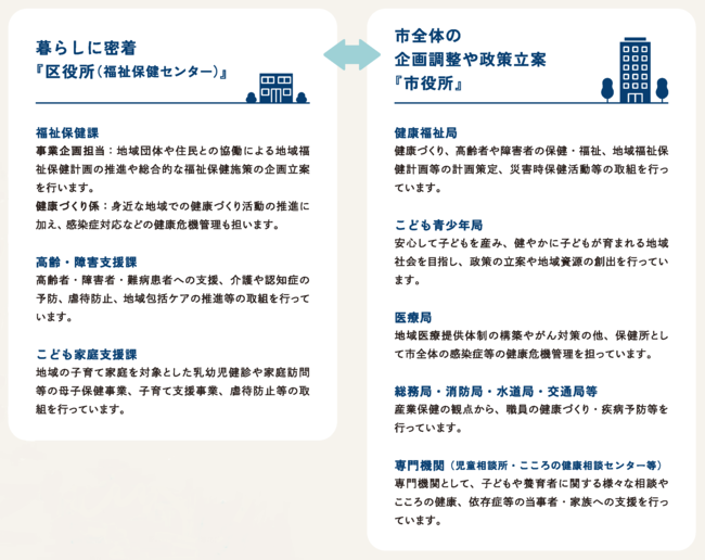 一つの基礎自治体で、母子や高齢者保健などを担う「市町村保健センター」と、感染症対応や障害者支援、難病患者支援などを担う「保健所」の機能があり、多様な経験が出来ます。