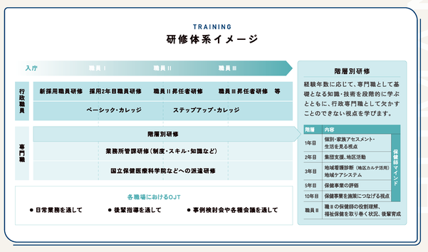 OJTと研修を組み合わせ、日常業務の課題への取組方法を研修の中で学び、職場に戻って実践するという積み重ねの中で、専門職としての知識・技術が磨かれていきます。