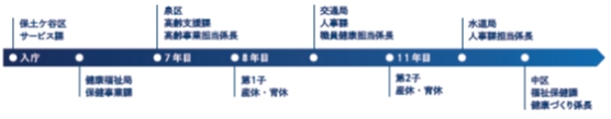 職員、キャリアを積んだ専任職、係長、課長、部長など、約600人の保健師が様々な部署で活躍しています。同期の仲間や男性の保健師も多く、経験を分かち合うことができます。子育てや介護などのライフイベントでは、制度を利用しながら仲間と助け合い、働ける環境です。