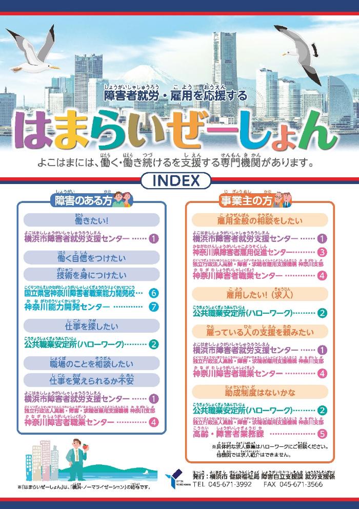 就労を目指している障害のある方や、障害のある方の雇用を考えている企業の方に、各種相談機関をご紹介しているパンフレットです。※「はまらいぜーしょん」は、「横浜・ノーマライゼーション」の略称です。