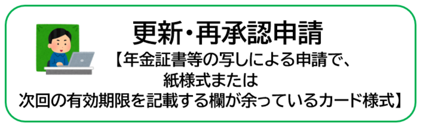 1.更新・再承認申請(年金証書の写しによる申請で、紙様式または次回の有効期限を記載する欄が余っているカード様式)