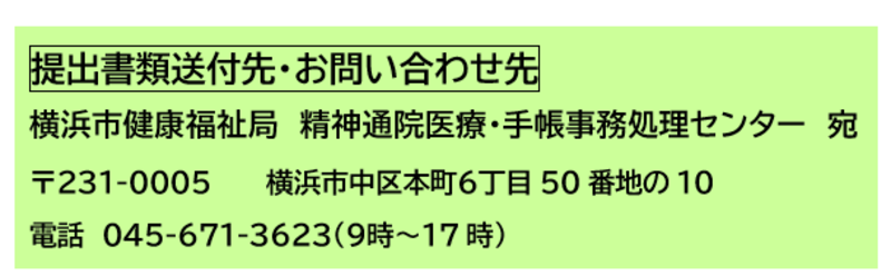 横浜市健康福祉局精神通院医療・手帳事務処理センター 〒231-0005横浜市中区本町6-50-10 電話045-671-3623