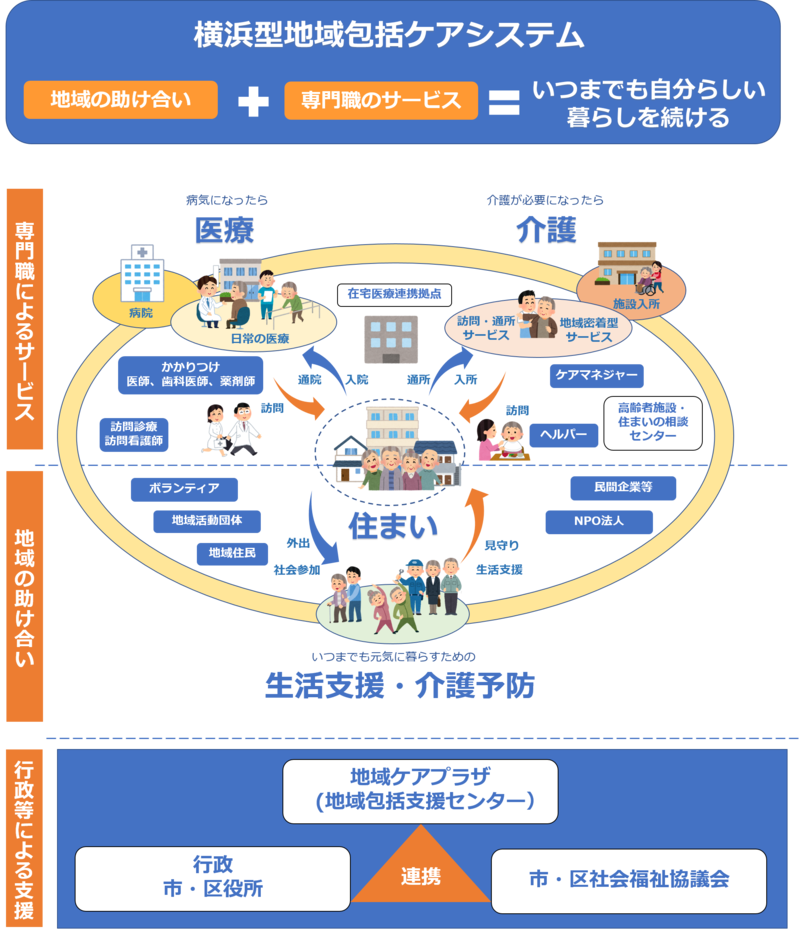 横浜市では、高齢者が可能な限り住み慣れた地域で、自分らしい暮らしを人生の最期まで続けられるよう、地域ケアプラザ(地域包括支援センター)を中心とした日常生活圏域単位で、地域特性に応じた地域包括ケアシステムの構築に取り組んでいます。