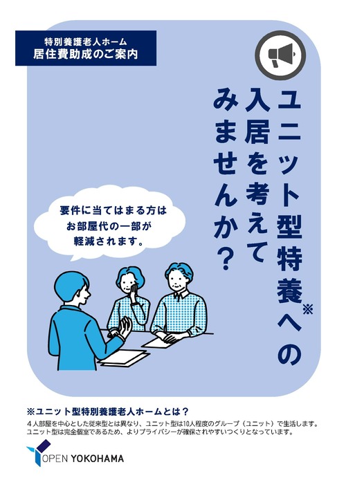 この助成は、横浜市内のユニット型特別養護老人ホームにおいてユニット型個室(ユニット型個室的多床室を除く。)を利用した場合の居住費が対象です。