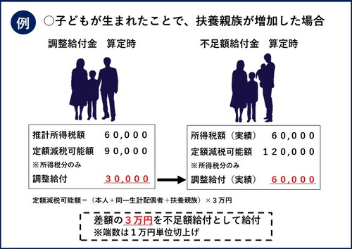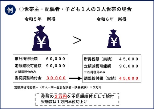 このため、「令和6年分所得税額」が確定したのちに、「本来給付すべき額」と、「実際に給付した額(調整給付)」との間で差額(不足)が生じた方に、不足する額を1万円単位で切り上げて給付します。