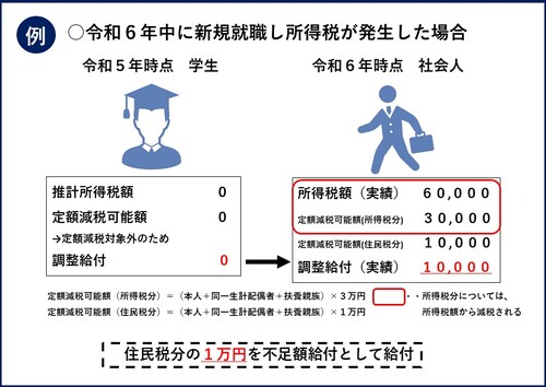【解説】令和5年中は所得がなかったため、本人として推計所得税、調整給付ともに0円だった者が、就職等により、令和6年所得税額が6万円となった。この場合、定額減税可能額(所得税分)の3万円分が減税され、所得税額は3万円となる。一方で定額減税可能額(住民税分)については、令和6年度分住民税が発生していないことで、減税することができないため、住民税分の1万円が不足額給付として給付されます。