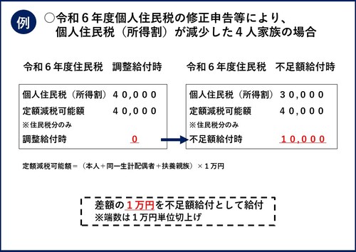 本ケースでは、減少後の個人住民税所得割で不足額給付の算定を行うため、個人住民税所得割が3万円、個人住民税分の定額減税可能額が4万円、不足額給付時の調整給付額は1万円となり調整給付0円と不足額給付時調整給付額1万円の差額の1万円が不足額給付として給付されます。