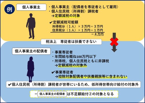 【解説】納税者である個人事業主の事業専従者(個人事業主の配偶者)であって、自身の給与収入がおおむね100万円に満たない者(所得税、住民税が非課税)が、世帯内に納税者(個人事業主)がいることで、低所得世帯向け給付金の対象ともならなかった場合、不足額給付の対象となります。