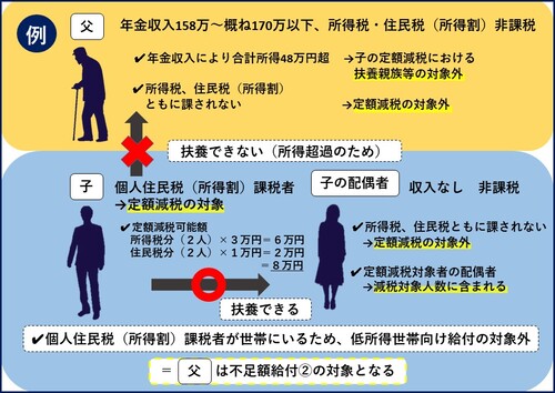 【解説】本人(父)の合計所得金額は48万円を超えるが、所得控除や、本人(父)の状況により所得税・住民税(所得割)ともに非課税で、本人及び子の扶養親族としても定額減税の対象でないものが、納税者(子)等と同居しているため、低所得世帯向け給付金の対象にもならなかった場合、本人(父)は不足額給付の対象となります。