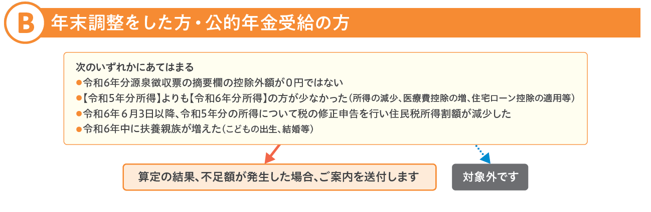 年末調整をした方・公的年金を受給されている方が、不足額給付の対象者に該当するかどうかをフローチャートで確認できます。また、該当する場合の手続についてご案内します。