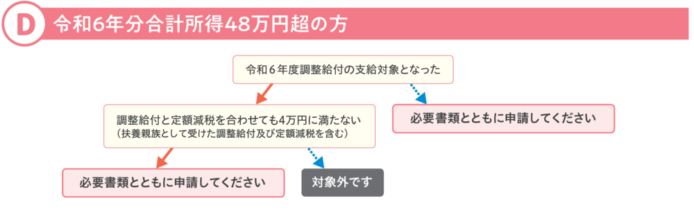 令和6年分所得48万円超の方が、不足額給付の対象者に該当するかどうかをフローチャートで確認できます。また、その場合の手続についてご案内します。