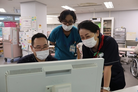 患者さんの個別性に合わせた看護介入を実践するためには、医師、リハビリテーションセラピスト、薬剤師、管理栄養士、医療ソーシャルワーカーなどとの多職種連携は重要です。特に地域連携部門の看護師や医療ソーシャルワーカーと協働し、患者さんやご家族の状況に応じて支援しています。