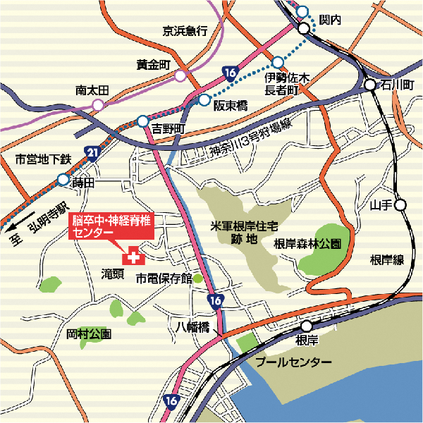 | 市営バス135系統 脳卒中・神経脊椎センター経由 根岸駅前行 「脳卒中・神経脊椎センター」下車 徒歩0分 |