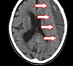脳が血腫によりじわじわ圧迫され、ついに麻痺や意識障害,認知機能障害を来します。手術治療により比較的良好な経過が期待できます。