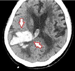 (下図2)脳皮質下での出血が脳室まで広がった脳室穿破の症例です。