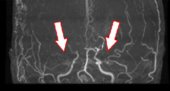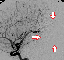 頭蓋内血管の閉塞がみられます。血管造影では血管が閉塞し、周囲に「もやもや病」がみられます。