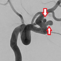 (下図)双こぶ状の脳動脈瘤に対してステント(金網でできた筒)を併用してコイル塞栓術を施行しました。動脈瘤は完全に閉塞しています。