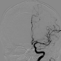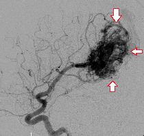 (下図)けいれんで発症した大型の脳動静脈奇形を、液体塞栓物質Onyxを用いて塞栓しました。ほぼ完全な閉塞が得られています。