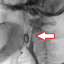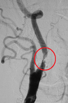 (下図)内頸動脈狭窄症に対して頸動脈ステント留置術を施行しました。良好な拡張が得られています。