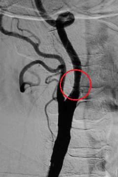 脳梗塞の原因となります。外科的治療では、直接血管を切開して動脈硬化の部分を取り除く頸動脈内膜剥離術(CEA)が行われます。血管内治療では、動脈硬化による狭い部分にステント(金網でできた筒)を送り込んで拡張する頸動脈ステント留置術(CAS)が行われます。