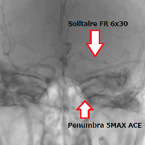 (下図)右片麻痺と意識障害で発症した左内頸動脈閉塞症で、ペナンブラ血栓吸引カテーテルとステント型血栓回収機器で血栓回収療法を施行しました。完全再開通が得られ、症状は改善しました。