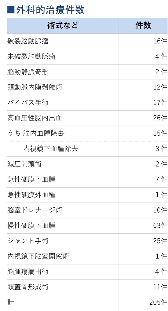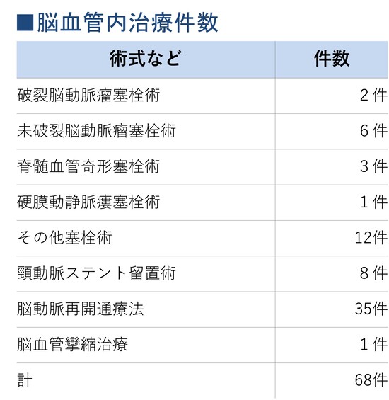 t-PA静脈内投与や血栓の局所線溶療法、デバイスによる機械的血栓回収療法のほか、脳出血に対する開頭血腫除去術や、穿頭血腫吸引術、減圧開頭術、くも膜下出血(脳動脈瘤)に対する開頭クリッピング術やコイル塞栓術など高度な専門医療は当部門で全て行うことができます。脳卒中の予防に関しても、内科的治療のみならず、頸動脈へのステント留置や内膜剥離術、頭蓋内動脈に対する血行再建術などを行っています。