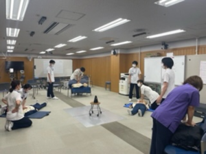 様々な場面を想定したEMコール対応研修や胸骨圧迫手技研修を計画的に行い、適切な手順・手技の習得を支援しています。また、ルート類(経鼻胃管、膀胱バルーンカテーテル、点滴等)の構造や扱い方についての研修も行っています。その他、患者誤認防止に向けた取り組みや、臨床場面でのヒヤリハット・インシデント事例を通じた対策の検討にも取り組んでいます。