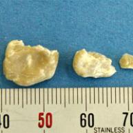 - 外観:大きさ13×11×5mm、10×6×6mm、6×4×2mm、重さ各0.48、0.23、0.02g、淡黄色の硬い固まりを認めました。