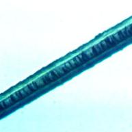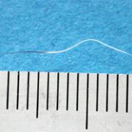 - 外観:長さ15mm、太さ50~70μm、先端部が細くなっており、先端から1/3が黒色で根元にかけて白色の波状の毛様の物質でした。