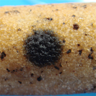 菓子の表面に黒色の丸いカビ様なものが付いていました。