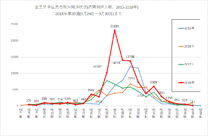 全国熱中症患者救急搬送状況:2018年第39週(9月24日~9月30日)まで
