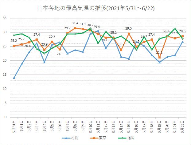 札幌・東京・福岡の最高気温の推移のグラフ(2021年)