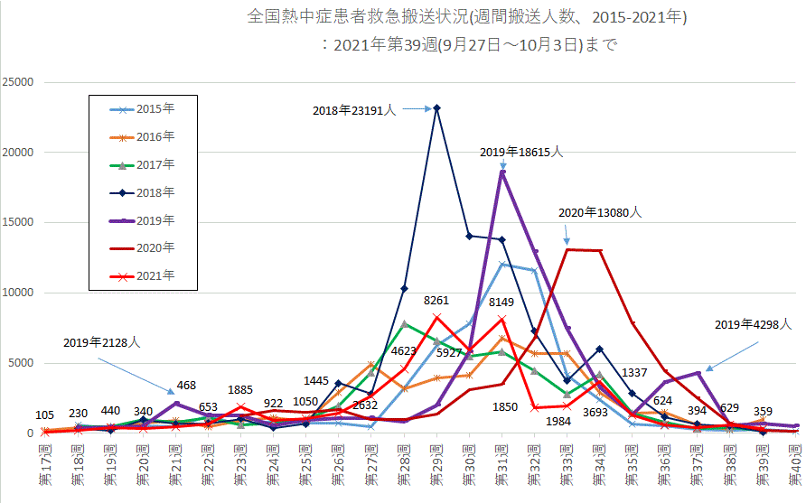 全国熱中症患者救急搬送状況:2021年第39週(9月27日~10月3日)まで