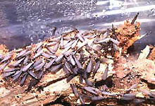 シロアリの社会は、女王、王、副女王、副王、職(働き)アリ、兵隊アリの階級で成り立っています。木造の建物の中でも水分の多い場所に好んで住み、木材を食べ、長い年月を経て大きな被害をもたらします。