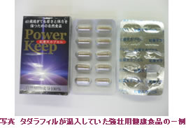 当所で強壮用健康食品を検査したところ、1カプセル中に20mg(シアリス1錠分)以上のタダラフィルが検出された事例がありました(写真参照)。