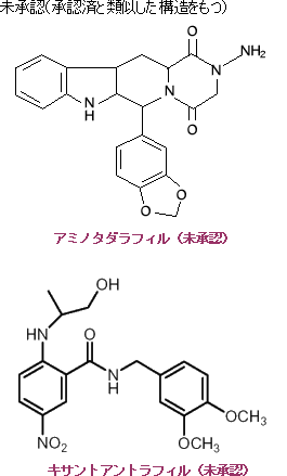 この検体はインターネットで販売されていたもので、それぞれ東京都と佐賀県でも検出されたという報告がありました。そのうちの1検体は輸入販売業者が横浜市内であったため、医療安全課ではこの業者に対し、商品の回収等を命じました。また、新たな問題として、シルデナフィル、バルデナフィル、タダラフィル等と化学構造が類似し、かつ強壮効果のある物質が混入されている商品も増えてきました(各物質の構造式は図を参照)。これらの物質は医薬品ではないので、安全性や毒性について調査されていないため、注意が必要です。